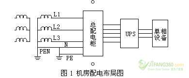 按照GB50174——93《電子計算機機房設(shè)計規(guī)范》,機房應(yīng)采用TN-C-S方式配電。進入建筑物以前為TN-C,進入后采用TN-S制,如圖1所示。若單相負荷嚴重不平衡,即相電流幅值不等,夾角不為120度,則流入中線中的電流較大,最大時可接近相電流。而由于中線阻抗的存在,中線電流在阻抗上就會產(chǎn)生電位差。零線上遠離進線端的點,相對于地電位就可能較高。