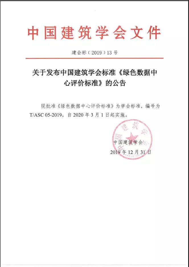 2019年12月31日,由中國建筑科學研究院有限公司主編的《綠色數(shù)據(jù)中心評價標準》經(jīng)中國建筑學會批準通過,定于2020年3月1日起正式實施,標準編號為T/ASC 05-2019,歡迎大家索取電子版,并采購該標準的正式出版物。