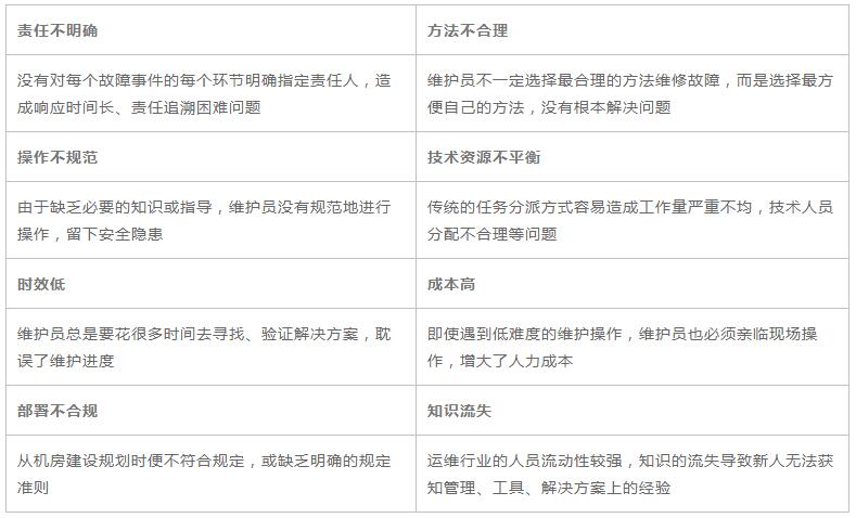 雖然大多數(shù)據(jù)中心已經(jīng)進(jìn)入到了智能化運(yùn)維的階段,但依然有一部分?jǐn)?shù)據(jù)中心還在采用傳統(tǒng)的運(yùn)維模式,每天通過人工去頻繁地監(jiān)測、維護(hù)、部署。這種模式過度依賴運(yùn)維人員的技能、經(jīng)驗(yàn)和責(zé)任心,很容易導(dǎo)致故障的重復(fù)發(fā)生,甚至引發(fā)其他更嚴(yán)重的問題。