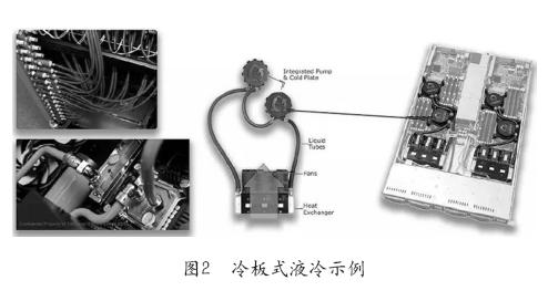 ①冷板式液冷:主要發(fā)熱器件固定在冷板上,依靠流經(jīng)冷板的液體將熱量帶走達(dá)到散熱的目的,是典型的間接接觸型液冷,由于硬盤,電源等其它發(fā)熱部件依然需要風(fēng)扇驅(qū)動(dòng)空氣來(lái)散熱,因此目前采用冷板式液冷的服務(wù)器也稱為氣液雙通道服務(wù)器。冷板式液冷技術(shù)經(jīng)過(guò)幾年的發(fā)展相對(duì)成熟,在近兩年的開(kāi)放數(shù)據(jù)中心峰會(huì)上,BAT等互聯(lián)網(wǎng)巨頭分別展示了其冷板式液冷服務(wù)器,并且,冷板式液冷服務(wù)器對(duì)于目前的數(shù)據(jù)中心的架構(gòu)影響不大,具有低噪音,高能效以及低總體擁有成本的特點(diǎn),可解決較高熱密度的數(shù)據(jù)中心的散熱問(wèn)題。圖2為冷板式液冷示例。
