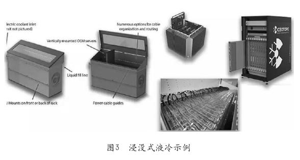 、诮䴖](méi)式液冷:顧名思義是將發(fā)熱元件浸沒(méi)在冷卻液中,依靠液體的流動(dòng)循環(huán)帶走IT設(shè)備運(yùn)行產(chǎn)生的熱量。浸沒(méi)式液冷是典型的直接接觸型液冷,目前比較流行的方式是將服務(wù)器浸沒(méi)在特殊設(shè)計(jì)的箱體中,但是這一架構(gòu)降低了數(shù)據(jù)中心建筑空間利用率,也有部分廠商為服務(wù)器定制設(shè)計(jì)了一個(gè)外殼,外殼將每一個(gè)服務(wù)器和冷卻液包裹起來(lái),在不改變現(xiàn)有數(shù)據(jù)中心部署架構(gòu)的前提下,優(yōu)化了空間利用率。浸沒(méi)式液冷由于發(fā)熱元件與冷卻液直接接觸,散熱效率更高,相對(duì)于冷板式液冷,噪音更低(完全沒(méi)有風(fēng)扇),解決更高熱密度和更加節(jié)能。圖3為浸沒(méi)式液冷示例。