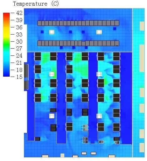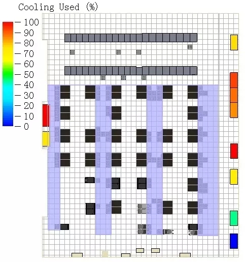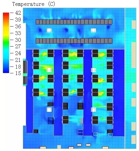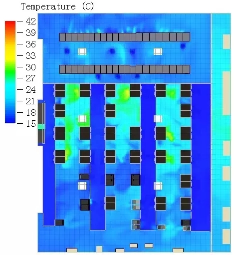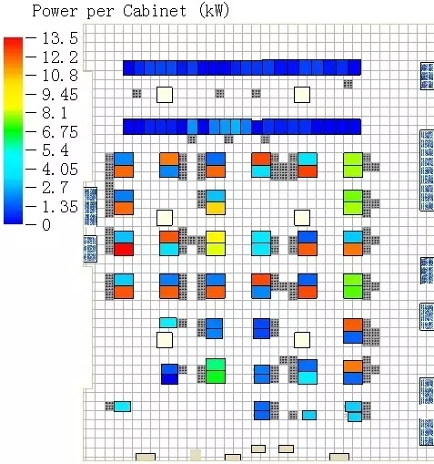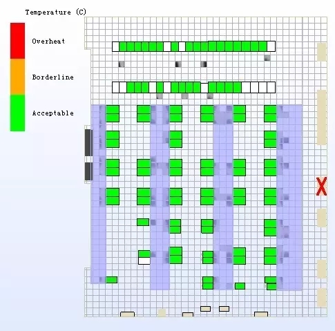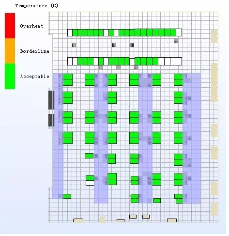 模擬結(jié)果:所有機(jī)柜最高進(jìn)風(fēng)溫度滿足要求,沒(méi)有機(jī)柜處于過(guò)熱或臨近過(guò)熱狀態(tài)。