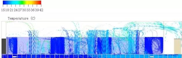 從上面的送風(fēng)氣流圖(不顯示機(jī)柜)可見(jiàn),在進(jìn)行了冷通道封閉后,空調(diào)送風(fēng)大部分在冷通道內(nèi),部分通過(guò)機(jī)柜底部的孔洞進(jìn)入機(jī)柜,而不是短路回到空調(diào)、或竄氣到熱通道。這樣空調(diào)送風(fēng)的利用效率得以提高。